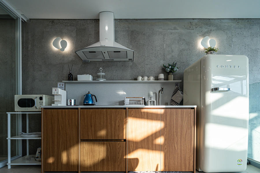 벨37 독채 풀빌라의 주방에는 냉장고와 전자레인지, 커피포트, 커피머신 등 조리 도구가 완비되어 있으며 거실에는 대형 스마트 TV가 설치되어 있어 다양한 엔터테인먼트를 즐길 수 있습니다.