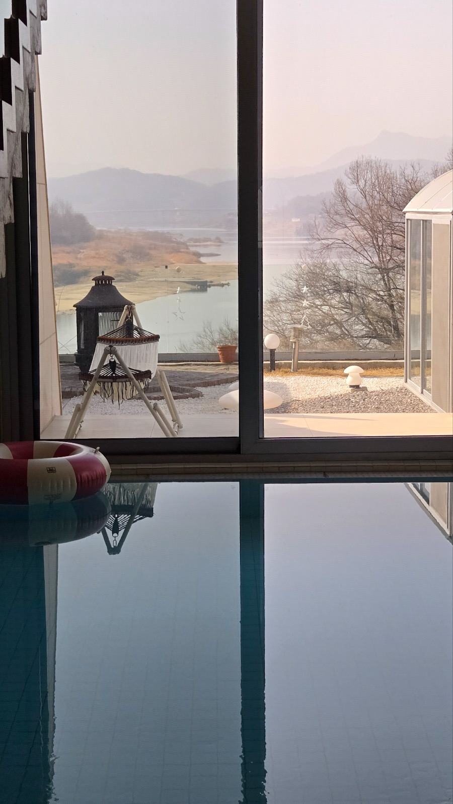 여기서 가장 매력적인 건 뭐니 뭐니 해도 프라이빗 사계절 실내 온수풀이예요.