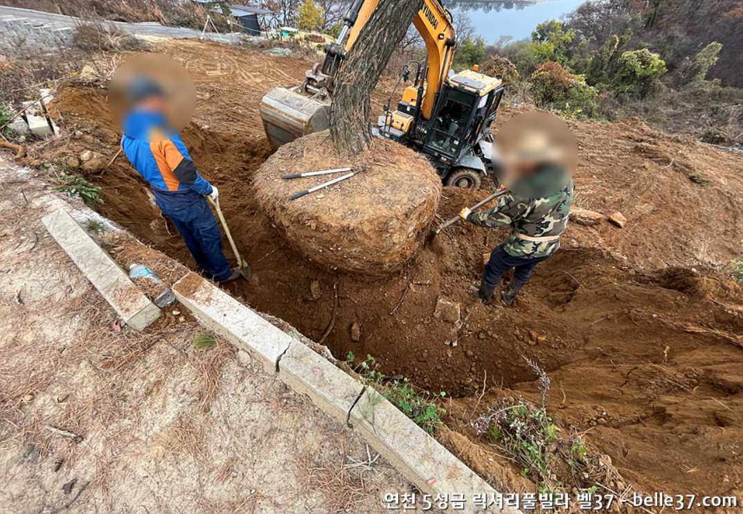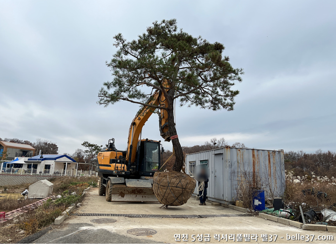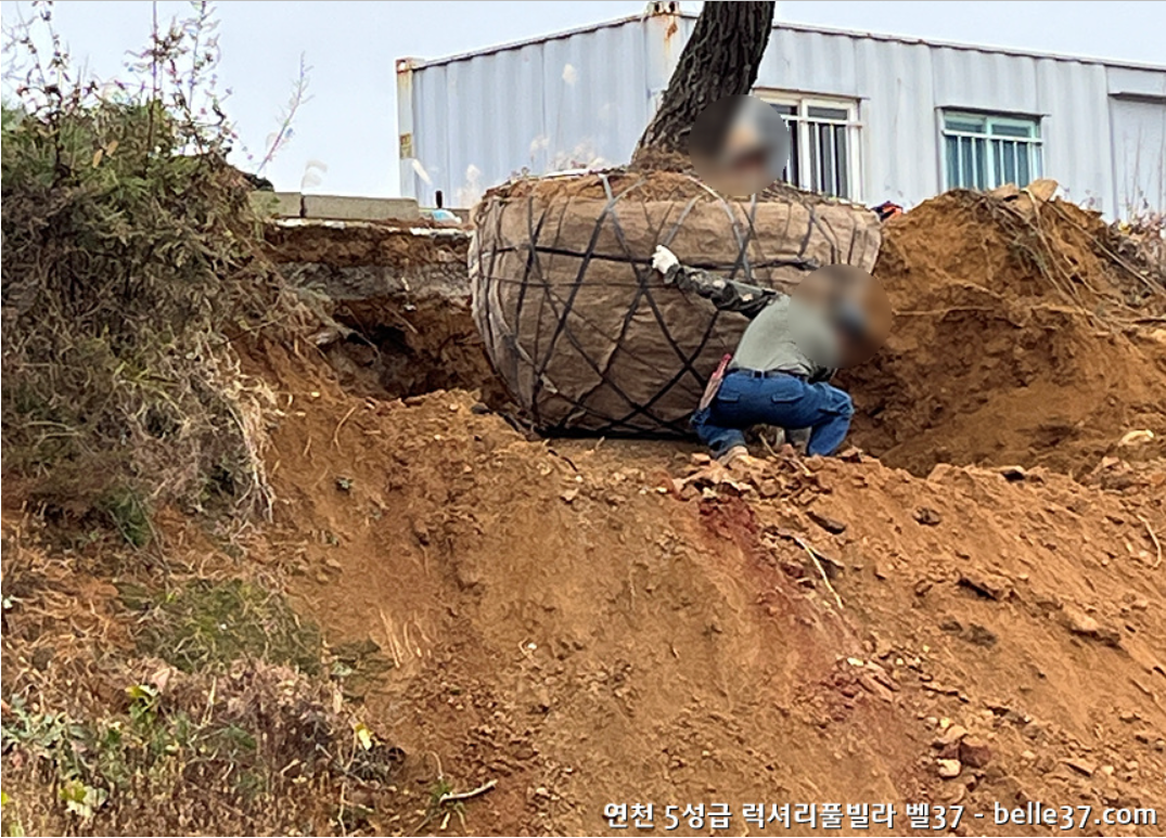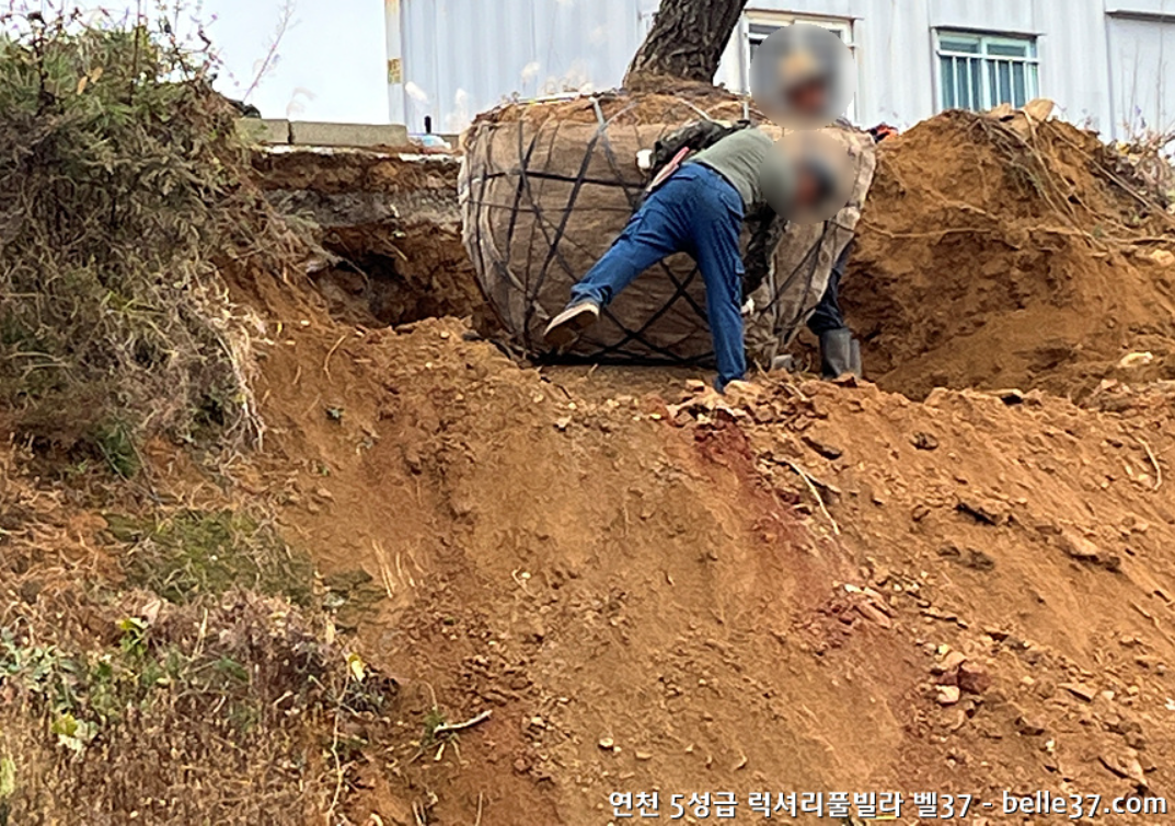연천동동마을 온수풀 펜션 가족 여행 벨37풀빌라 소나무 이식과정이었습니다.