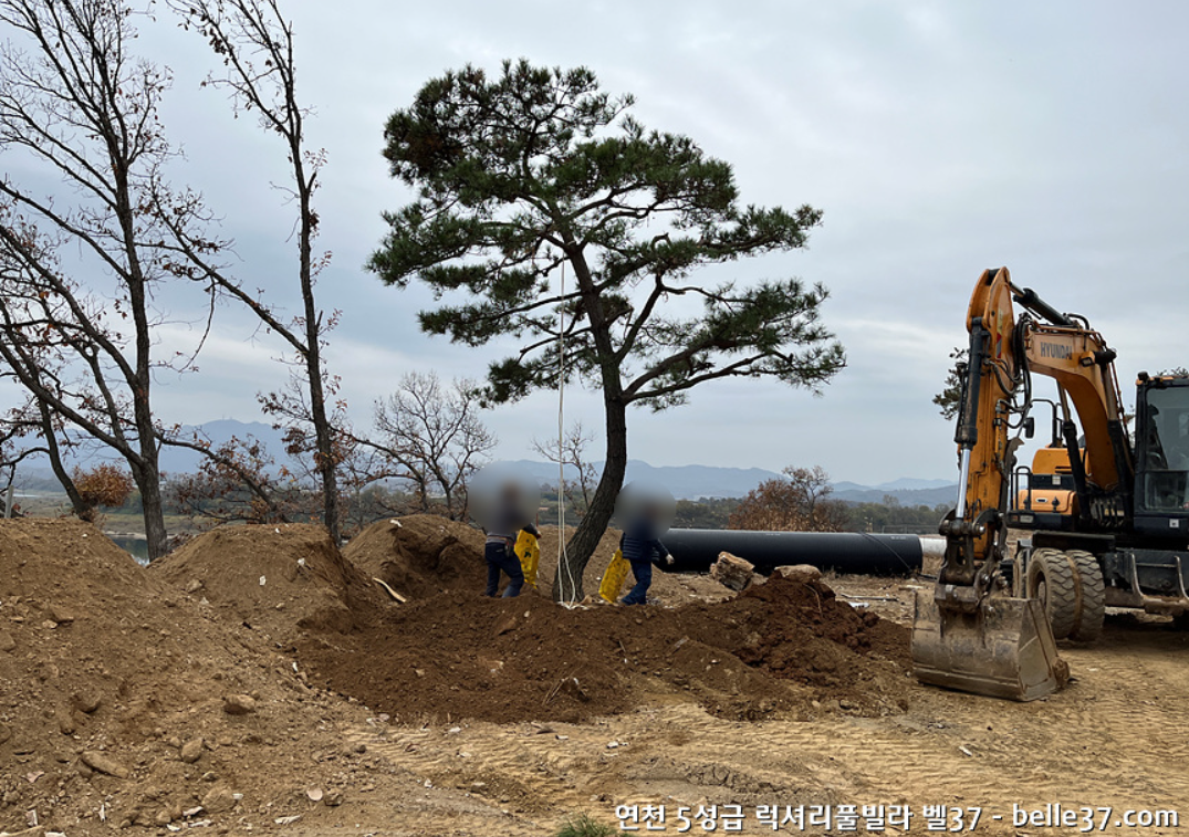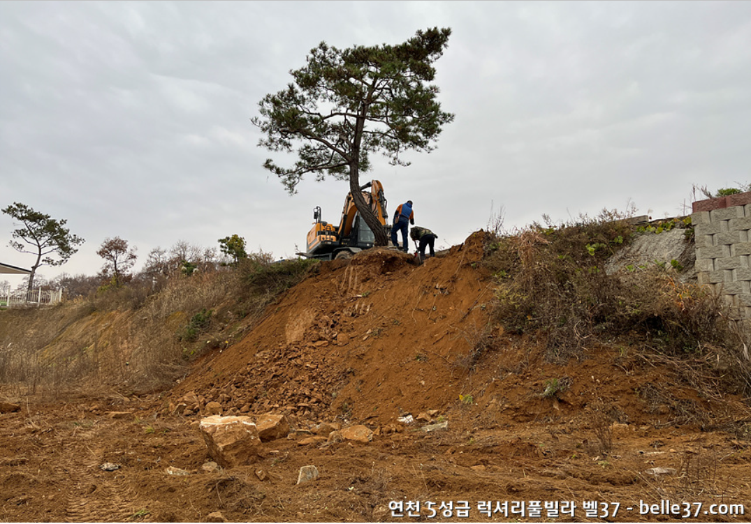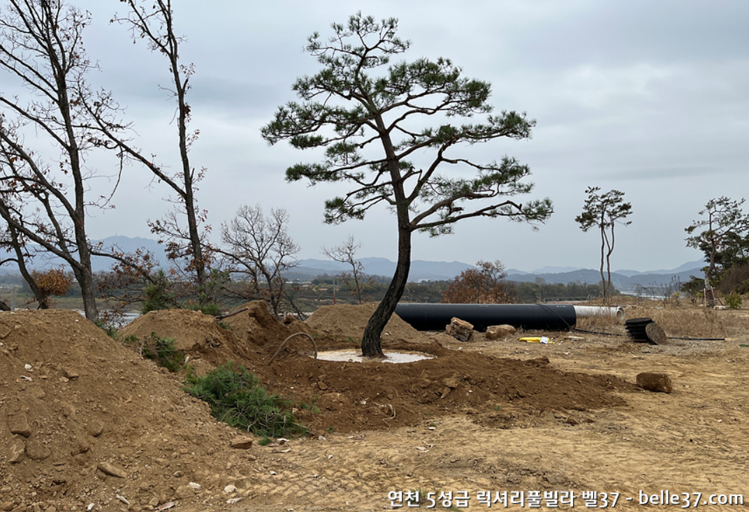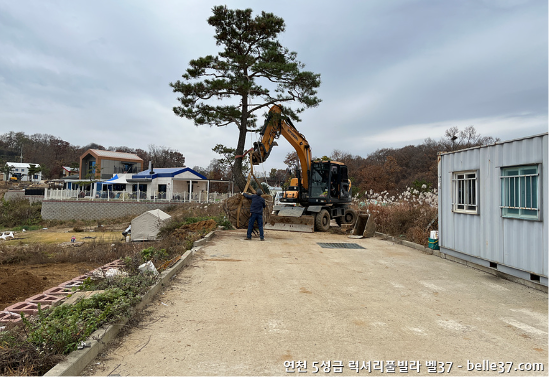 연천동동마을 온수풀 펜션 가족 여행 벨37풀빌라 소나무 이식과정이었습니다.