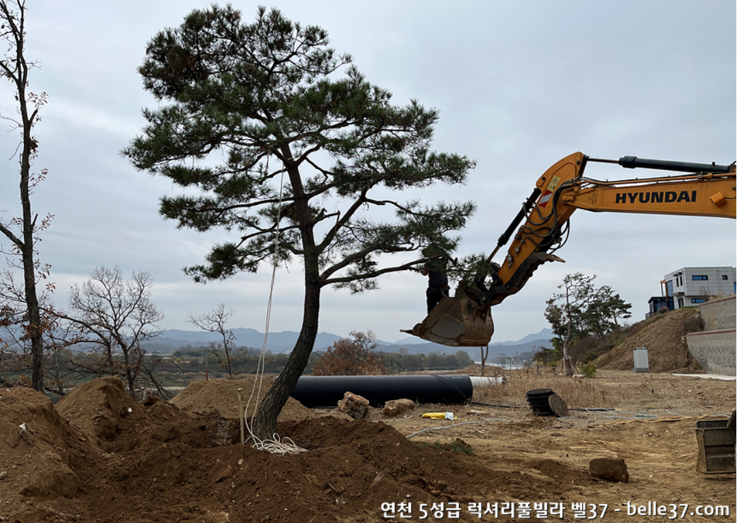 해당 부지에는 도로 중앙에 오래된 소나무 한그루가 있는데.. 초기 땅을 분양 받으신 분이 소나무가 아까워 그대로 놔뒀다고 하는데 벨37 신축을 앞두고 소나무를 어찌할까 고민하다가 벨37 부지에는 마땅히 이식할 장소가 없어 벨37의 임시 캠핑장이 있는 동동마을 3마을로 이식하기로 결정하고 소나무 이식작업에 착수했습니다.