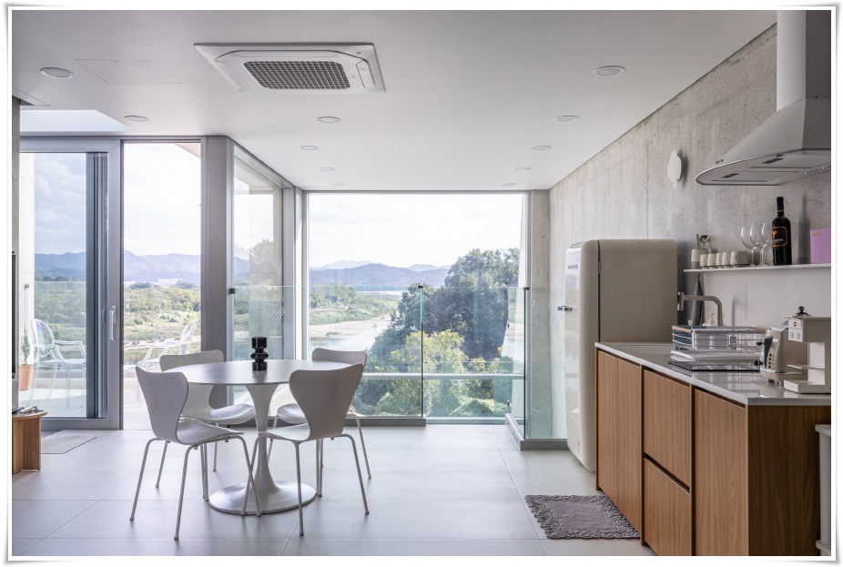 현관문을 들어서면 홀 정면 대형 통유리창으로 시원하게 펼쳐지는 임진강이 한눈에 펼쳐집니다.