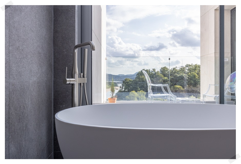 욕실은 프라이빗 한 공간이지만 샤워커튼을 제치면 임진강 리버뷰를 감상하면서 샤워를 하고 욕조에 누워서 밖으로는 임진강 뷰와 천창으로는 뻥뚫린 하늘을 감상하실 수 있는 구조입니다.