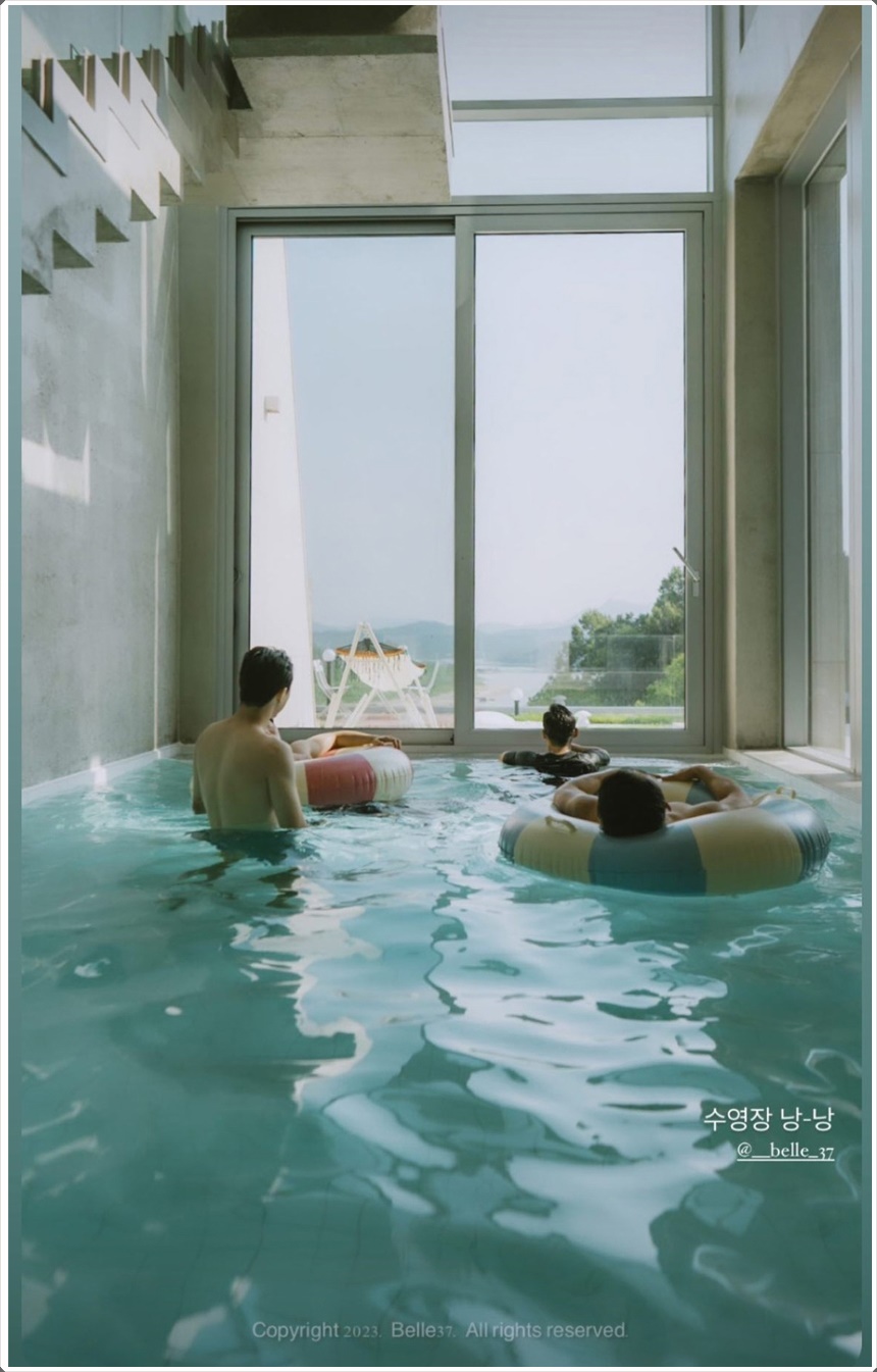 벨37 수영장은 외부의 시선이 차단되어 프라이빗 하지만 수영장 내부에서는 시원하게 펼쳐지는 임진강 뷰를 개방감있게 감상하실 수 있습니다.