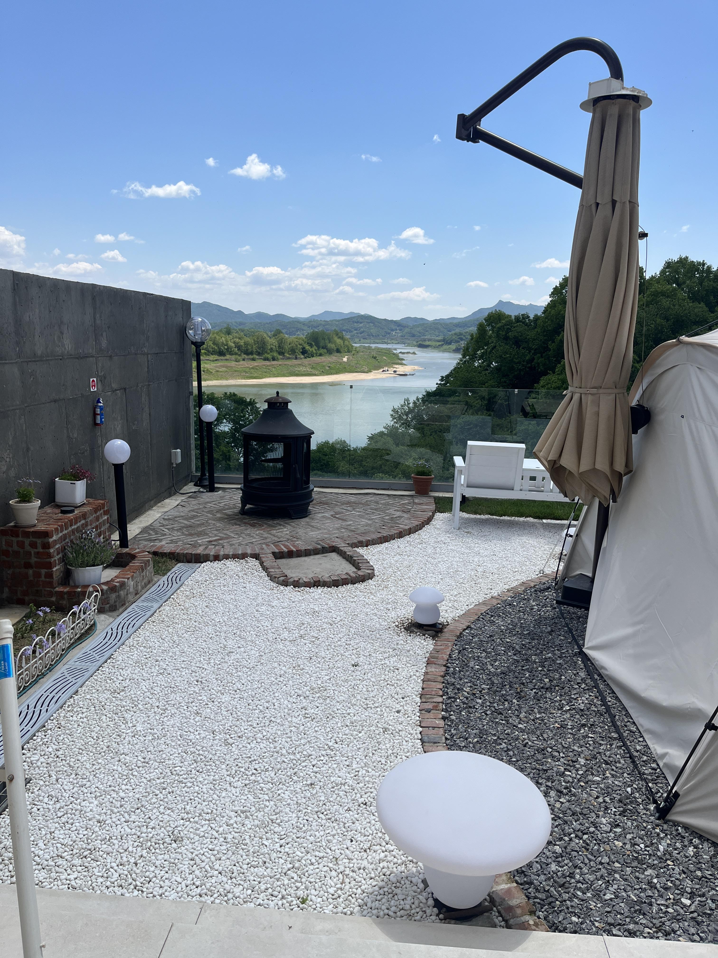 Private Belle37 누구에게도 방해받지 않는 나만의 공간에서 진정한 휴식을 느껴보세요. 1층 감성 정원의 데크 및 원형잔디에서 더 가까이 감상할 수 있는 임진강 파노라마 리버뷰와 개별 바비큐 공