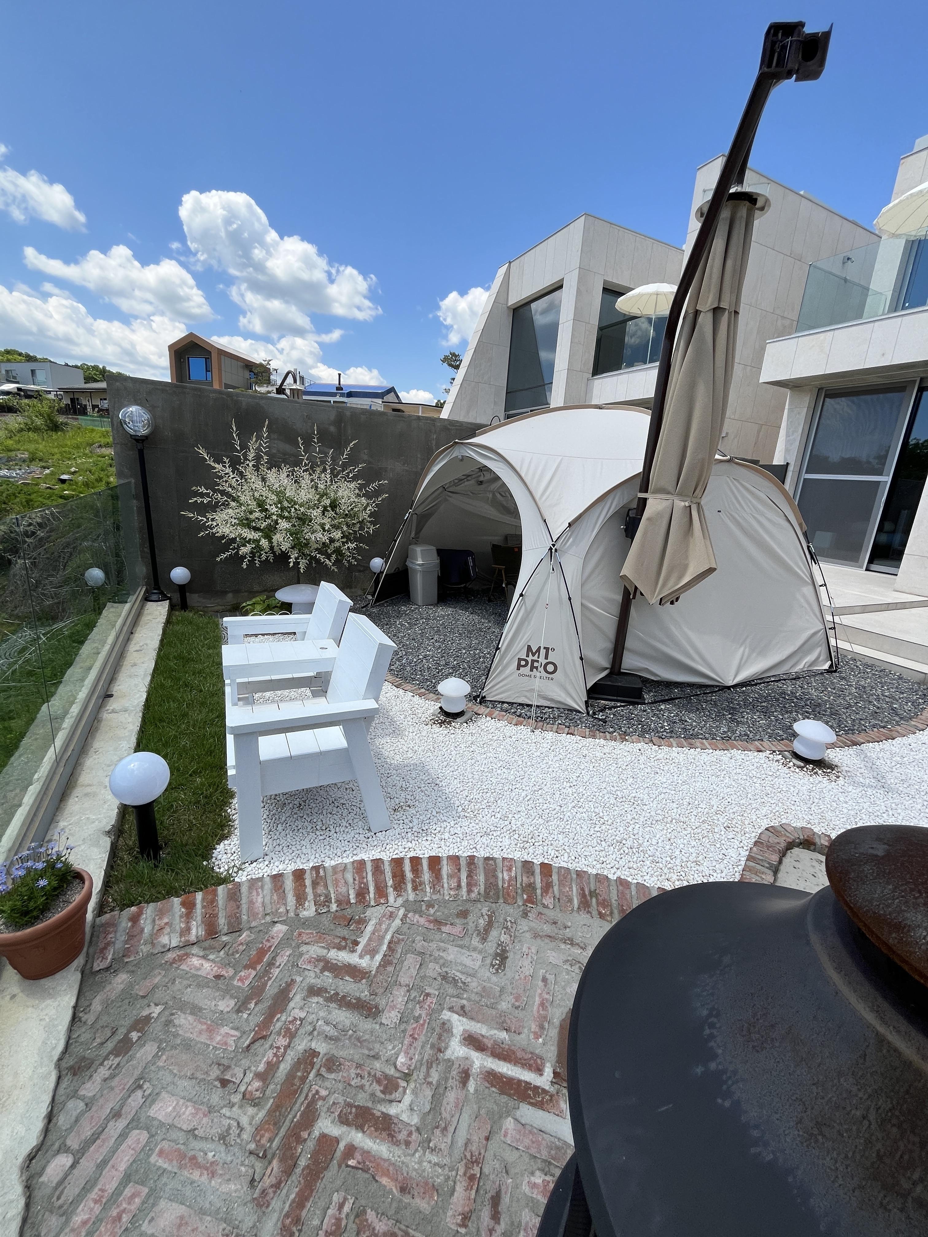 1층 실내 수영장에서 물놀이를 하고 나서 야외 정원으로 바로 연결되어 나갈 수 있는데요. 야외 정원도 넓고 커서 야외에서 더 가까이 임진강 뷰 감상이 가능하고 독채풀빌라 답게 야외 정원도 개별 사용 공간으로 캠핑 분위기의 돔셜터가 설치되어 있어 캠핑 분위기에서 즐거운 바비큐를 즐기실 수 있고 불멍도 하실 수 있습니다.