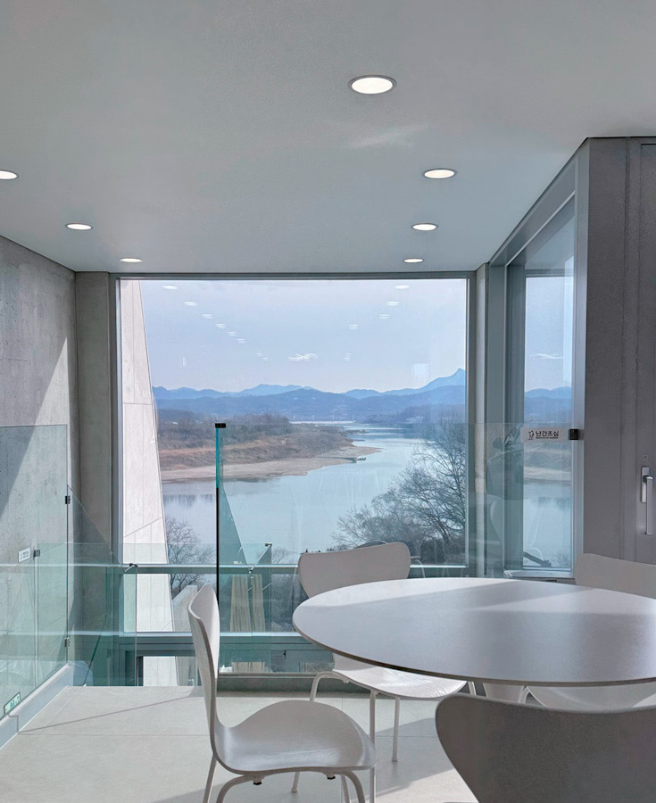 주차장에 차를 주차하고 2층 객실 출입문을 열고 객실로 들어서면 제일 먼저 보게 될 거실 뷰입니다. 대형 통유리창으로 보이는 임진강 액자뷰가 어떤가요? 사진으로 보는 것보다 실제 보면 더 멋집니다. 제 실력 부족인지 사진과 동영상은 한계가 있어요..ㅎ