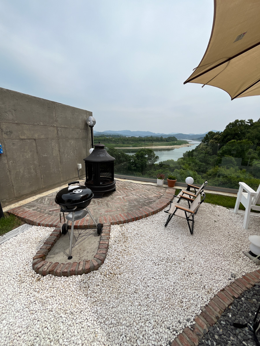야외 정원에는 캠핑 분위기의 바비큐장과 불멍존이 있어서 더 가까이서 임진강 뷰를 감상할 수 있고 즐거운 식사도 할 수 있는 공간입니다. 보기보다 야외 정원이 커서 여유롭게 야외 활동을 할 수 있어 방문객들에게 좋은 반응을 얻고 있는 힐링 장소입니다.