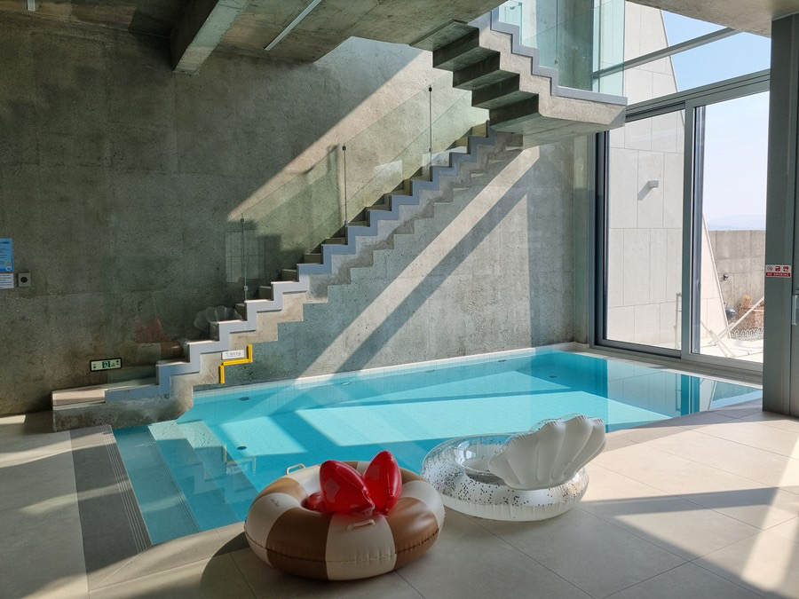 벨37 독채 풀빌라 실내 수영장은 풀과 홀 사이에 칸막이 벽이 없는 개방형 수영장입니다.