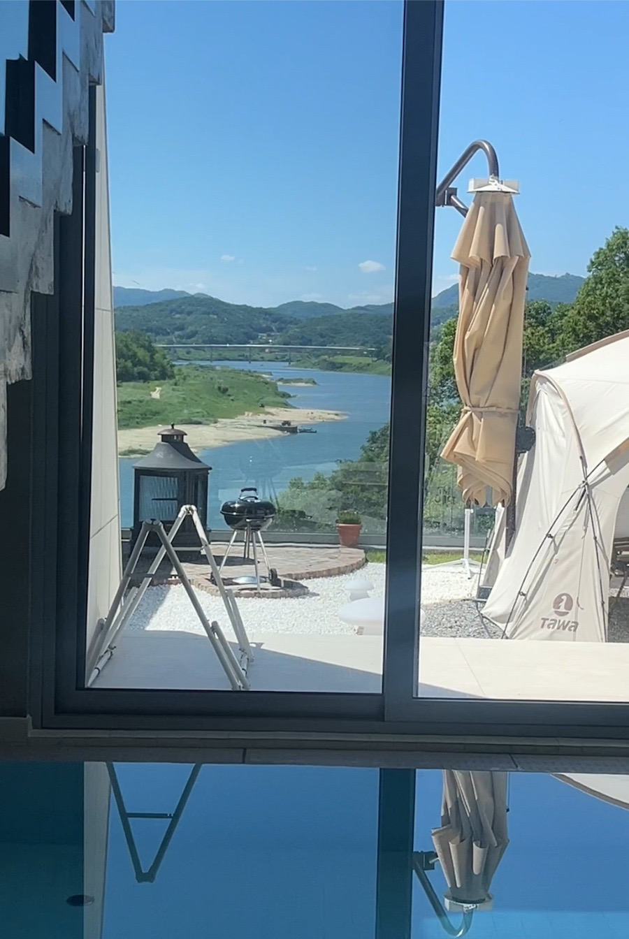 수영장에서 보는 임진강 뷰입니다. 야외 정원 불멍존도 보이네요...^^