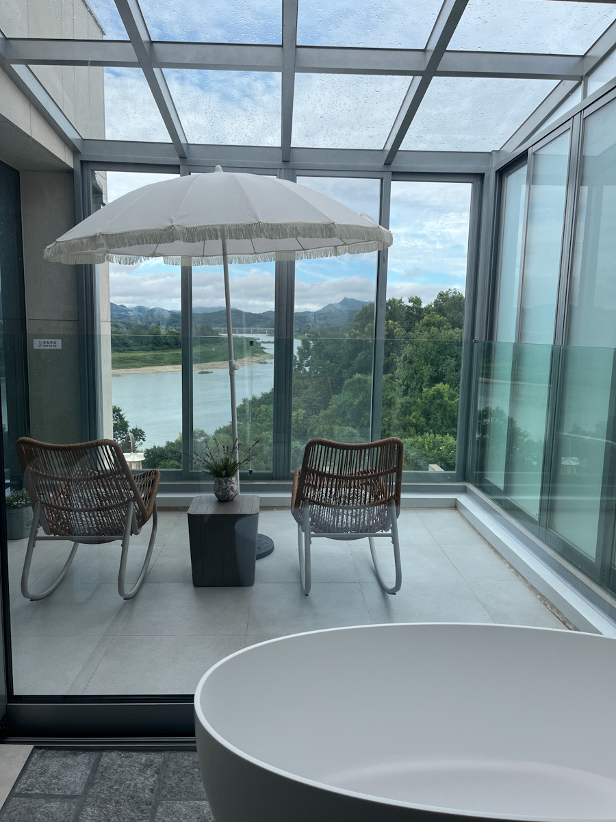 각동 풀빌라는 넓은 실내 공간에서 전면 대형 통유리창을 통한 임진강 뷰를 감상할 수 있으며, 각 층마다 개별 화장실과 세면실, 샤워실이 구비되어 있어 큰 불편함 없이 머물 수 있습니다. 이러한 고급스러운 인테리어와 편의 시설 덕분에 가족 단위는 물론 커플, 친구들끼리의 모임 장소로도 인기가 많습니다. 또한 야외에는 멋진 자연경관이 펼쳐져 있어 창 밖으로 보이는 풍경만으로도 마음이 편안해지는 느낌을 받을 수 있습니다.