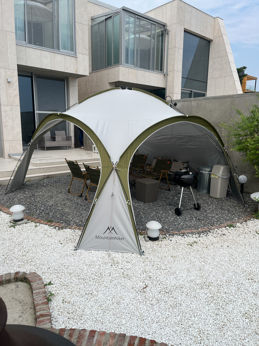 객실 내부의 사계절 온수 수영장과 바로 연결되는 야외 정원에는 캠핑 분위기의 바비큐 시설과 불멍존도 마련되어 있습니다. 바비큐장에는 캠핑용 대형 돔쉘터가 설치되어 있어 날씨에 구애받지 않고 바비큐 파티를 즐길 수 있습니다. 실내에는 주방 시설도 잘 갖추어져 있어 직접 간단한 요리를 해 먹을 수도 있습니다.