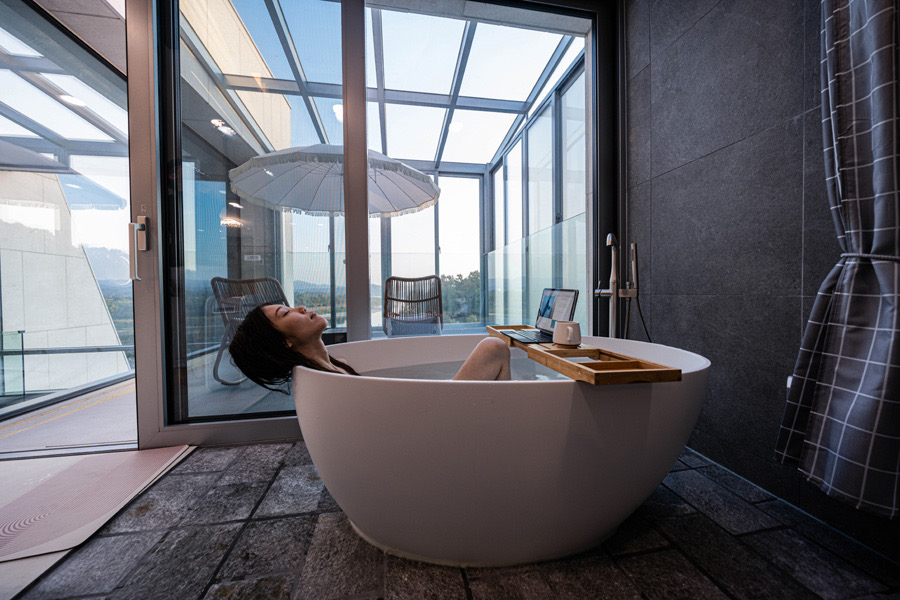 욕실에는 임진강 뷰를 즐기면서 반신욕과 전신욕을 즐길 수 있는 자쿠지를 갖추고 있어 물놀이 후에 따뜻한 물에 몸을 담그고 일상의 피로를 풀 수 있어 좋습니다.