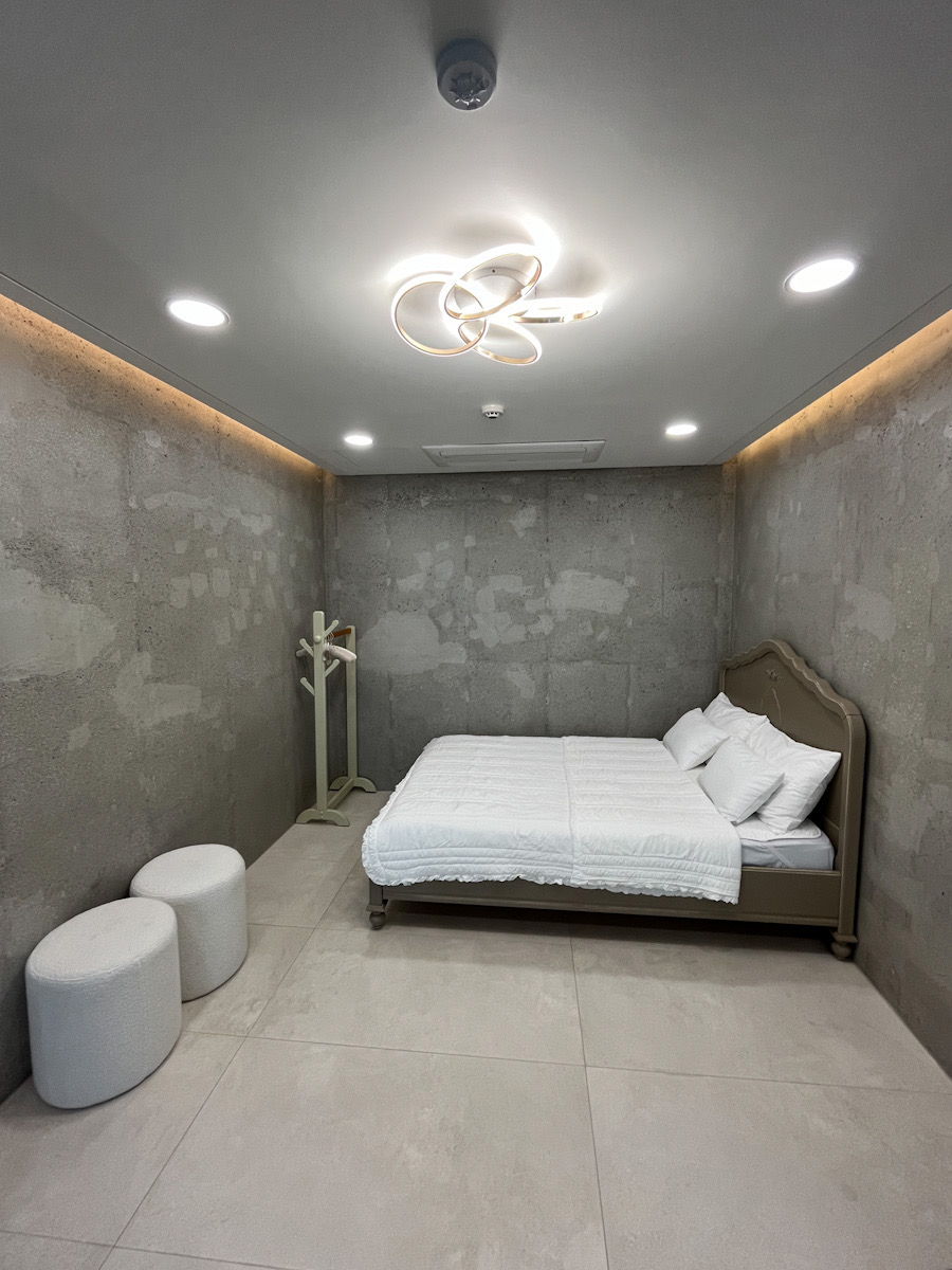 침실에도 천정형 시스템 냉난방기가 갖춰져 있으며 퀸사이즈의 침대가 구비되어 있고 추가 인원은 토퍼와 이불을 제공합니다.