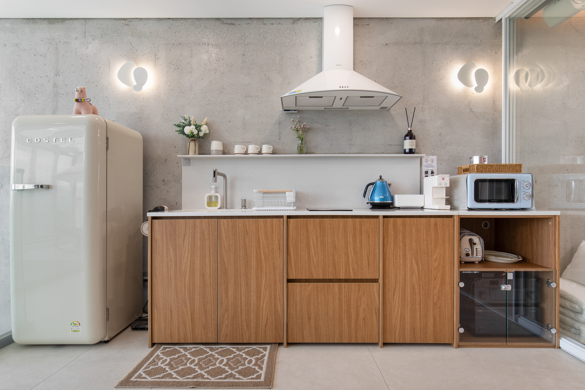 넉넉한 조리 공간과 고급 조리 도구, 그리고 중형 냉장고까지 갖추고 있습니다.