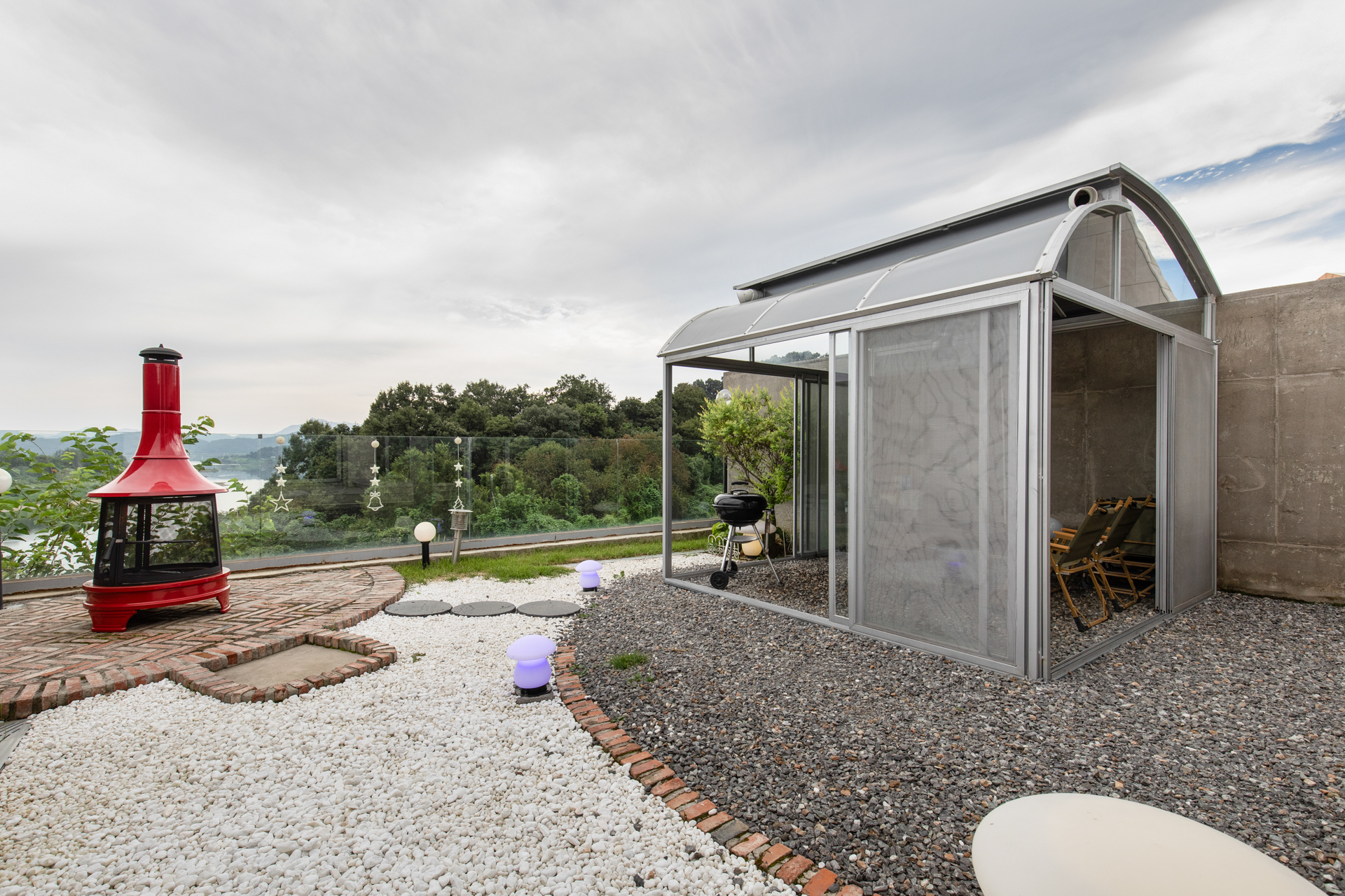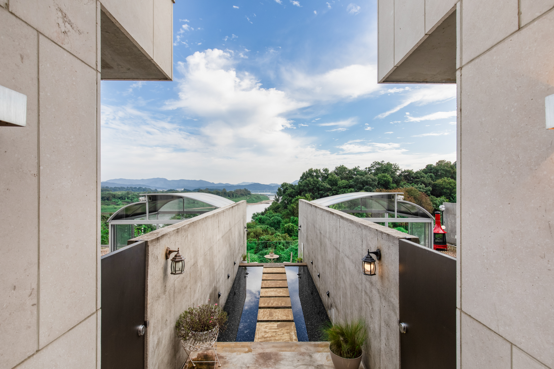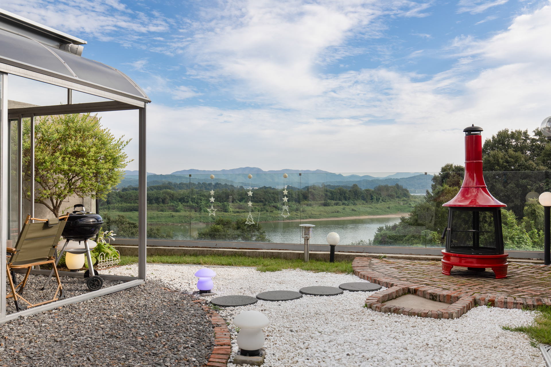 주차장에서 한 걸음 걸어 나오면 펼쳐지는 탁 트인 임진강 전경은 마치 한 폭의 그림 같은 이국적인 풍경입니다. 이국적인 자연경관과 잘 어우러지는 고급스러운 외관의 독채 건물이 조화를 이루며, 낮에는 햇살 가득한 자연 풍경을, 밤에는 은은한 조명과 별빛이 어우러진 로맨틱한 분위기를 자아냅니다.