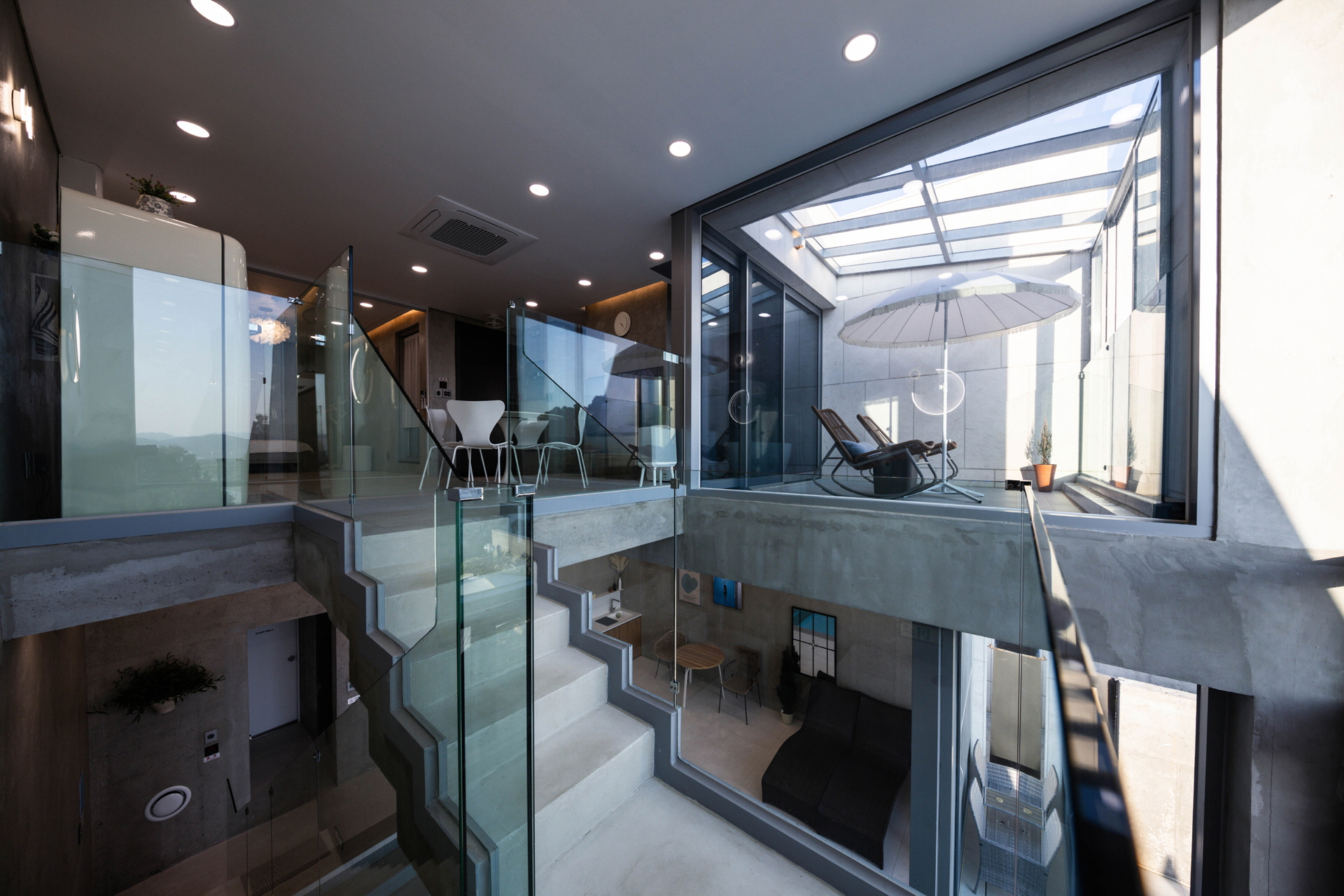 계단을 따라 자연스럽게 매치되는 간접 조명은 밤이 되면 마치 은은한 갤러리를 걷는 듯한 분위기를 자아내고, 투명한 유리 난간은 그 빛과 선을 막힘없이 흘려보냅니다.