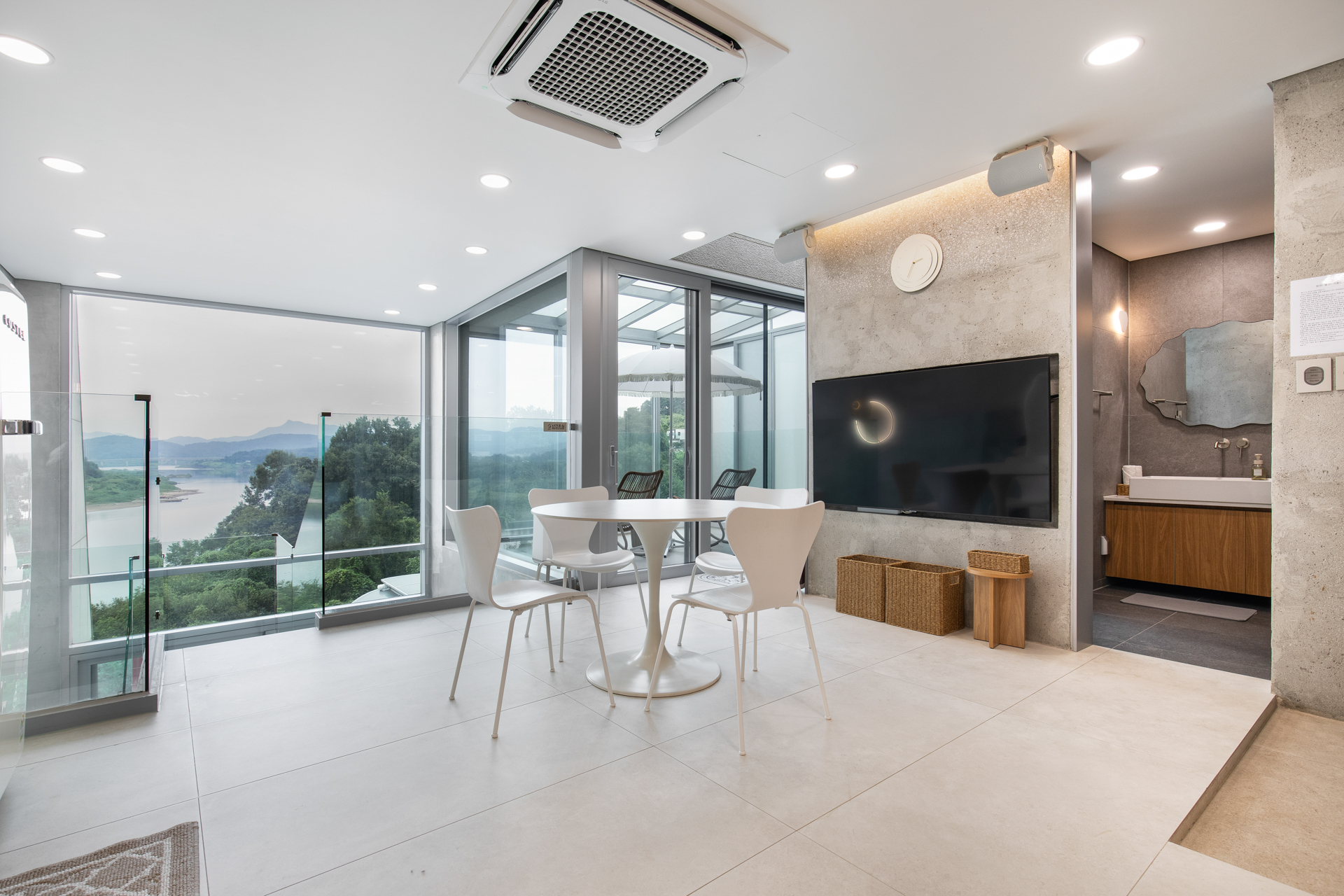 전면 대형 통유리창으로 보이는 시원한 임진강 리버뷰를 침대에 누워서도 감상할 수 있는 곳.